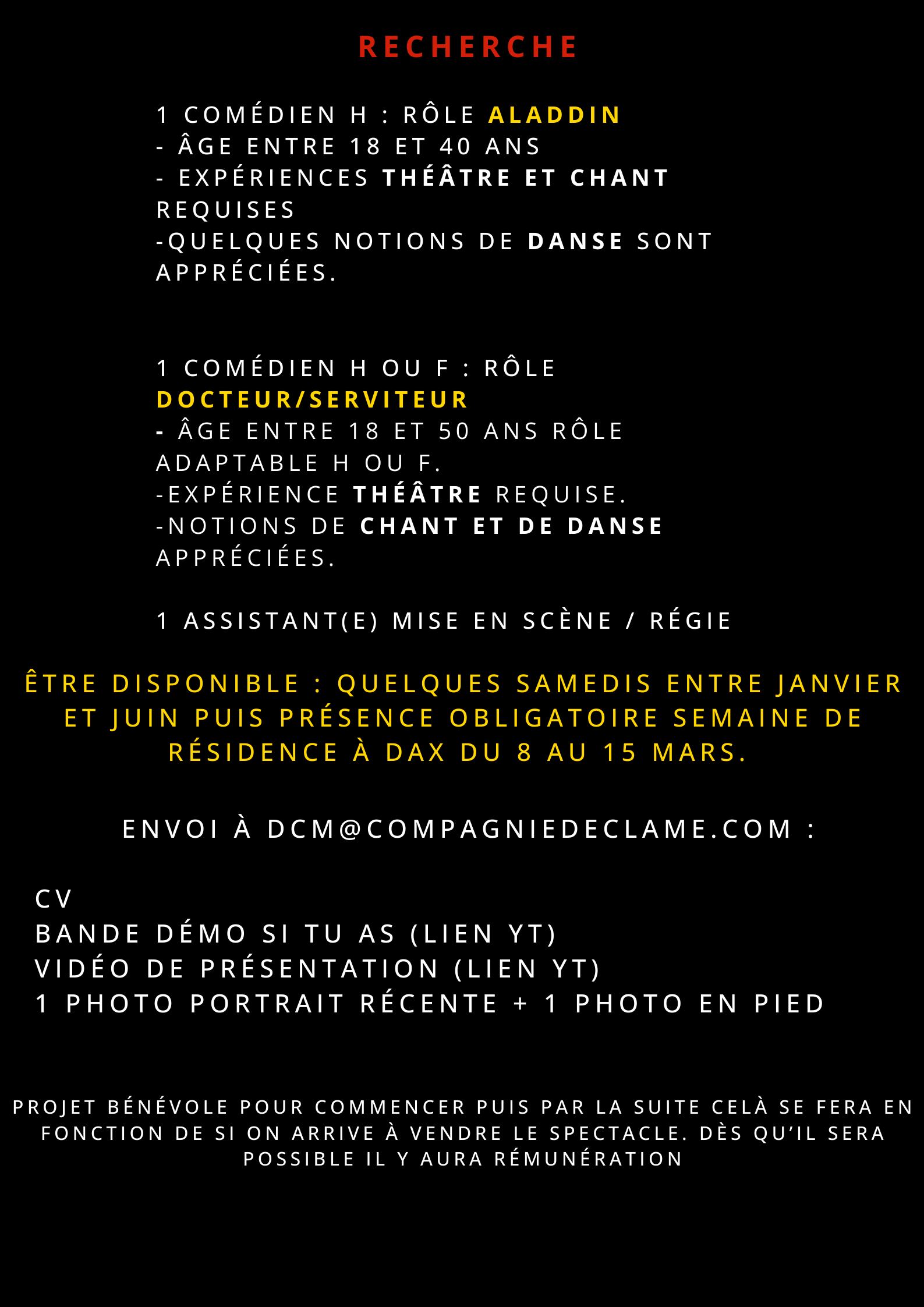 La Cie Déclamé est à la recherche de comédiens et comédiennes ainsi que d’un/e assistant(e) mise en scène / régie pour son prochain spectacle !